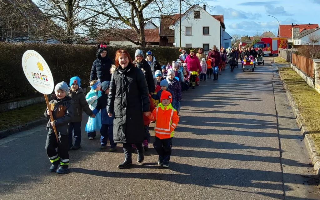 Auch der Rußige Freitag wurde zum Fasching feiern genutzt. Alle Kinder kamen erneut verkleidet in die Kita, es wurde ausgelassen getanzt und am Büfett geschlemmt. Dann stand das nächste Highlight an: Der inzwischen zur Tradition gewordene Faschingszug der Kita bewegte sich mit Krach, Musik und vielen Gästen durch den Ort. An verschiedenen Stellen wurde Station gemacht, gesungen und getanzt.