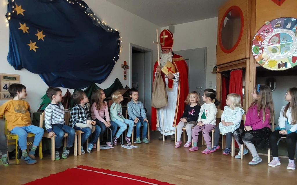 Im Vorfeld wurden die Gruppenräume geschmückt, verschiedene Nikolauslieder gesungen und Gedichte geübt. Um 9:00 Uhr war es dann soweit und der Hl. Mann klopfte an die Kita Tür. In den Gruppen versammelten sich die Kinder im Stuhlkreis, begrüßten Bischof Nikolaus und wiesen ihm einen vorbereiteten Platz zu. Im Gespräch stellte Nikolaus mit den Kindern fest, woran ein Bischof zu erkennen sei und wiederholte mit ihnen die Legende vom Kornwunder.